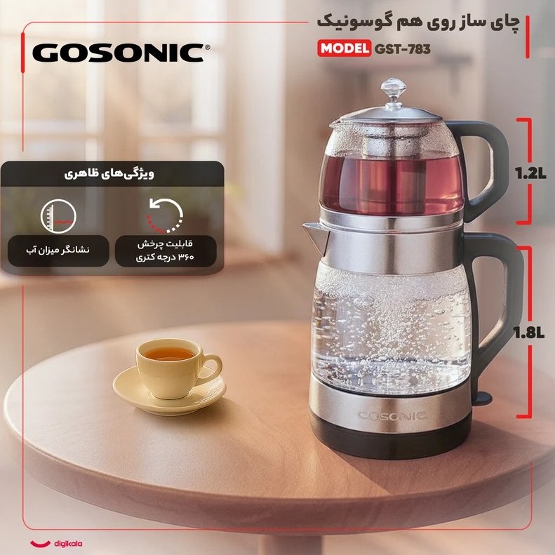 توان مصرفی2200 واتظرفیت کتری1.8 لیترظرفیت قوری 1.2 لیترجنس قوریشیشه پیرکس استجنس کتریاستیل و شیشه مقاومقابلیت چرخش روی پایه دارد360 درجه